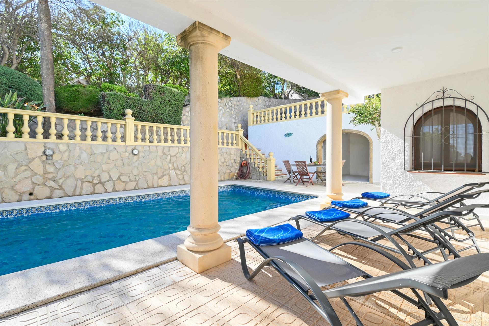 Prachtige en vrolijke villa in Jávea, Costa Blanca, Spanje met privézwembad voor 8 personen. Het huis is gelegen in een residentiële strandomgeving.