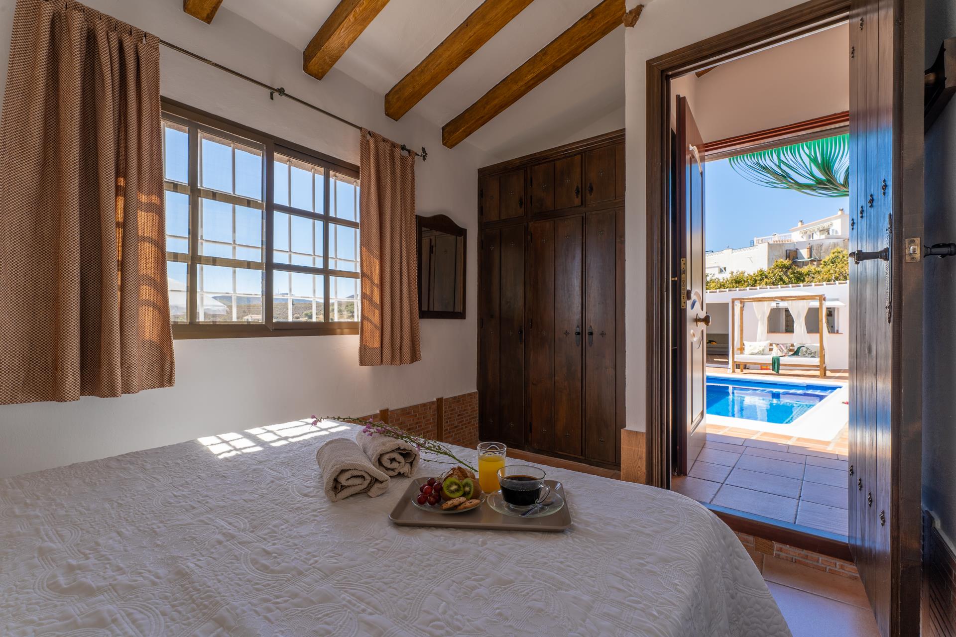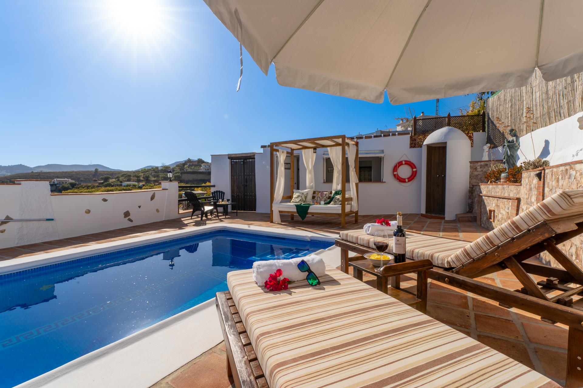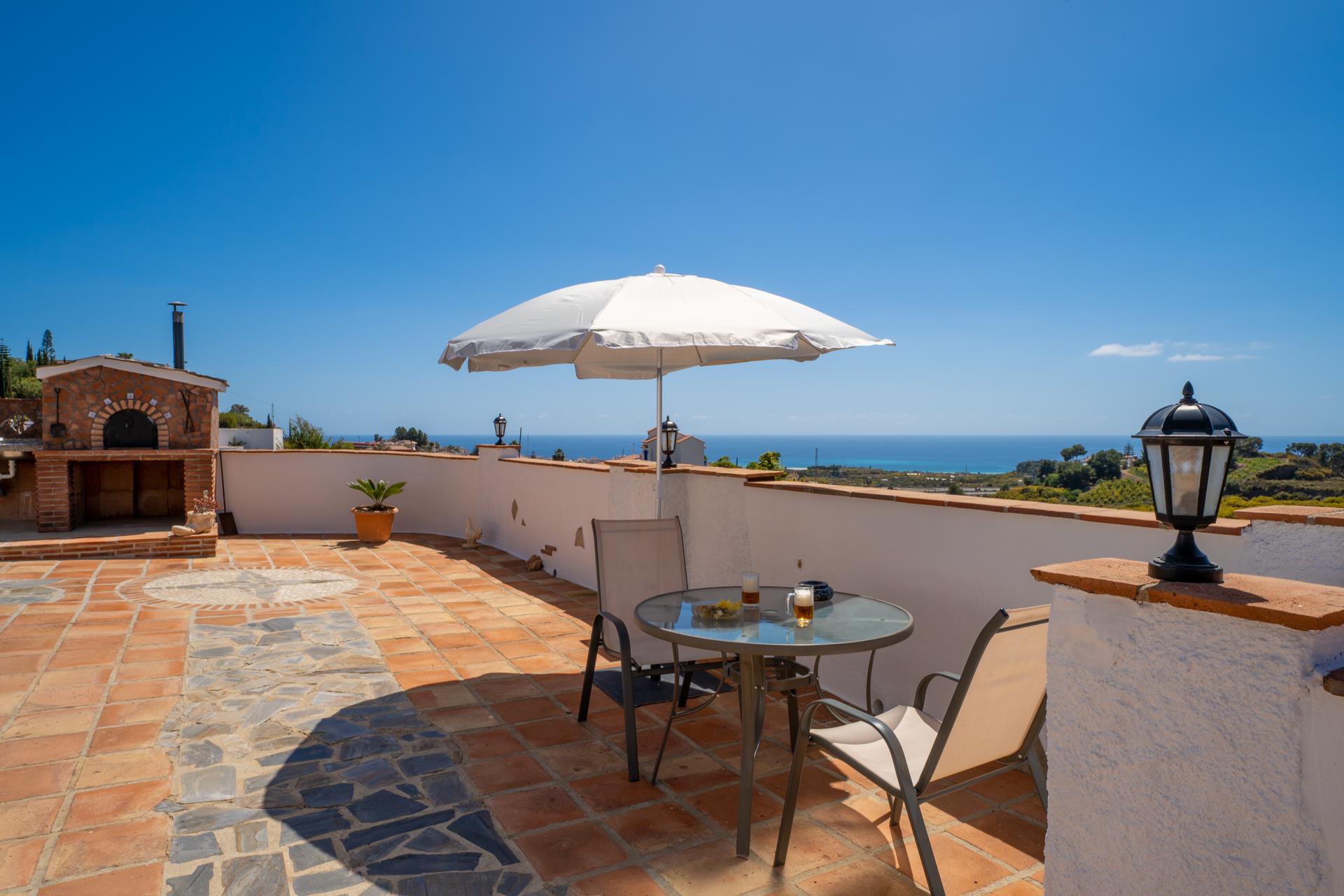 Dit is een lieflijke, rustieke "cortijo", met een gunstige ligging, net van de weg Nerja - Frigiliana. Vijf minuten rijden en u bent in Nerja (2 kilometer) met zijn winkels, restaurants en tapasbars. Voor gasten die niet steeds willen autorijden is een bushalte en een restaurant in de buurt (100 meter). Het huisje heeft een zonnige ligging en vanaf de schaduwrijke veranda heeft u een prachtig uitzicht op Nerja tot aan de Middellandse Zee. Op de veranda vindt u een ingebouwde barbecue en patiomeubilair zodat u hier heerlijk buiten kunt eten. Bij het privé zwembad van 5 x 3 meter aan de achterkant van het huis heeft u dezelfde schitterende zeezichten. Bij het zwembad is het heerlijk vertoeven op het ruime zonneterras met ligstoelen.
