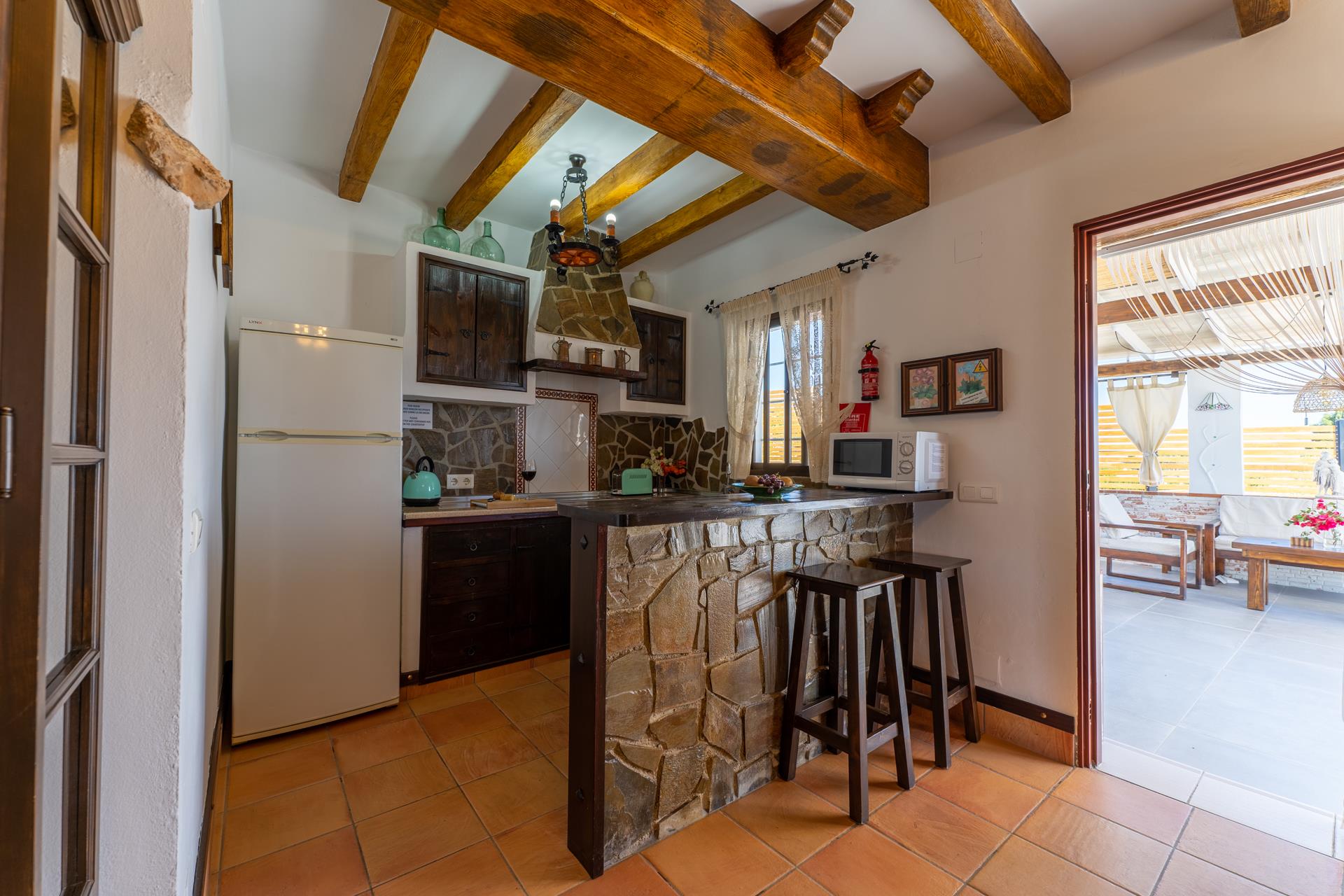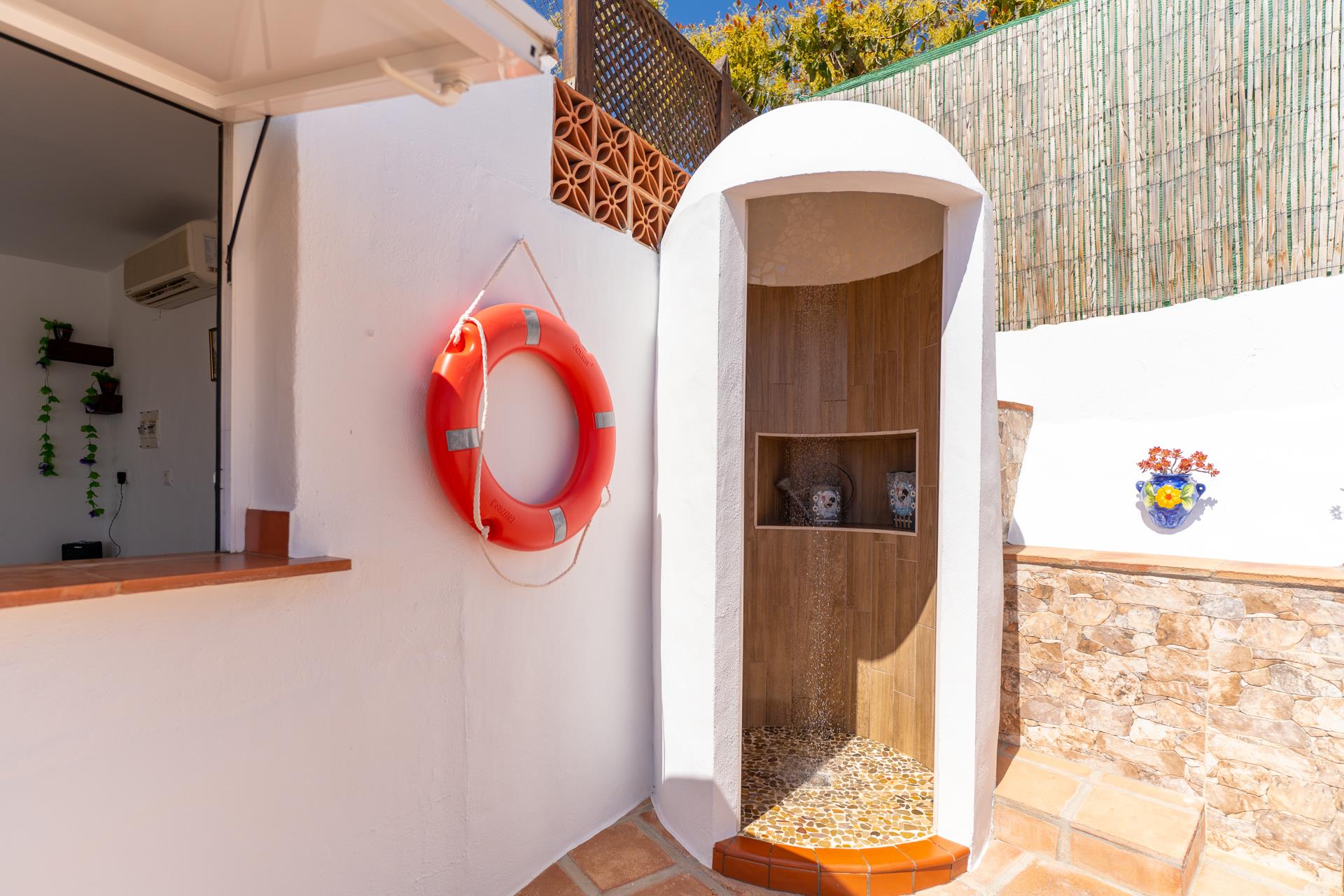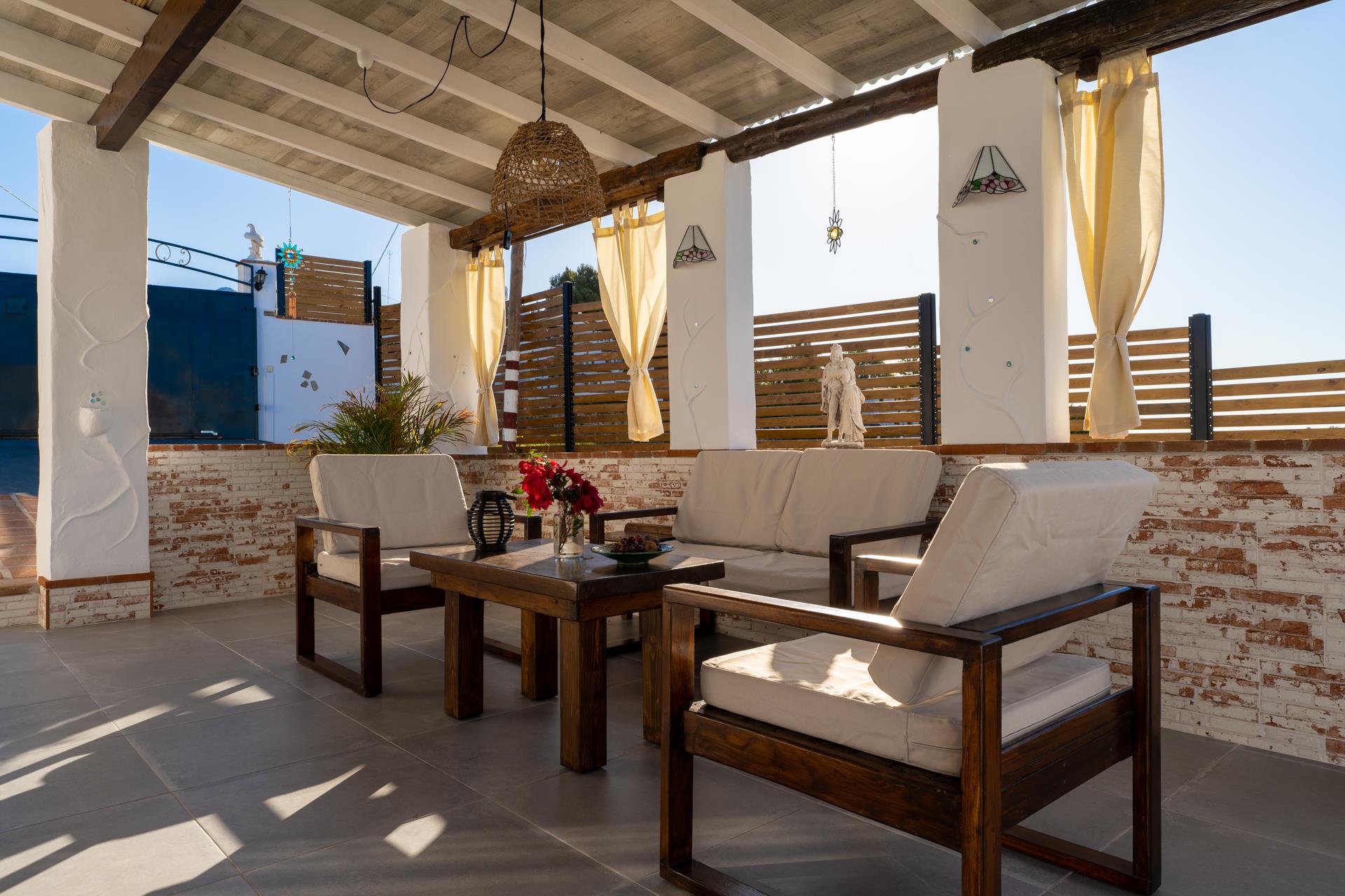Dit is een lieflijke, rustieke "cortijo", met een gunstige ligging, net van de weg Nerja - Frigiliana. Vijf minuten rijden en u bent in Nerja (2 kilometer) met zijn winkels, restaurants en tapasbars. Voor gasten die niet steeds willen autorijden is een bushalte en een restaurant in de buurt (100 meter). Het huisje heeft een zonnige ligging en vanaf de schaduwrijke veranda heeft u een prachtig uitzicht op Nerja tot aan de Middellandse Zee. Op de veranda vindt u een ingebouwde barbecue en patiomeubilair zodat u hier heerlijk buiten kunt eten. Bij het privé zwembad van 5 x 3 meter aan de achterkant van het huis heeft u dezelfde schitterende zeezichten. Bij het zwembad is het heerlijk vertoeven op het ruime zonneterras met ligstoelen.