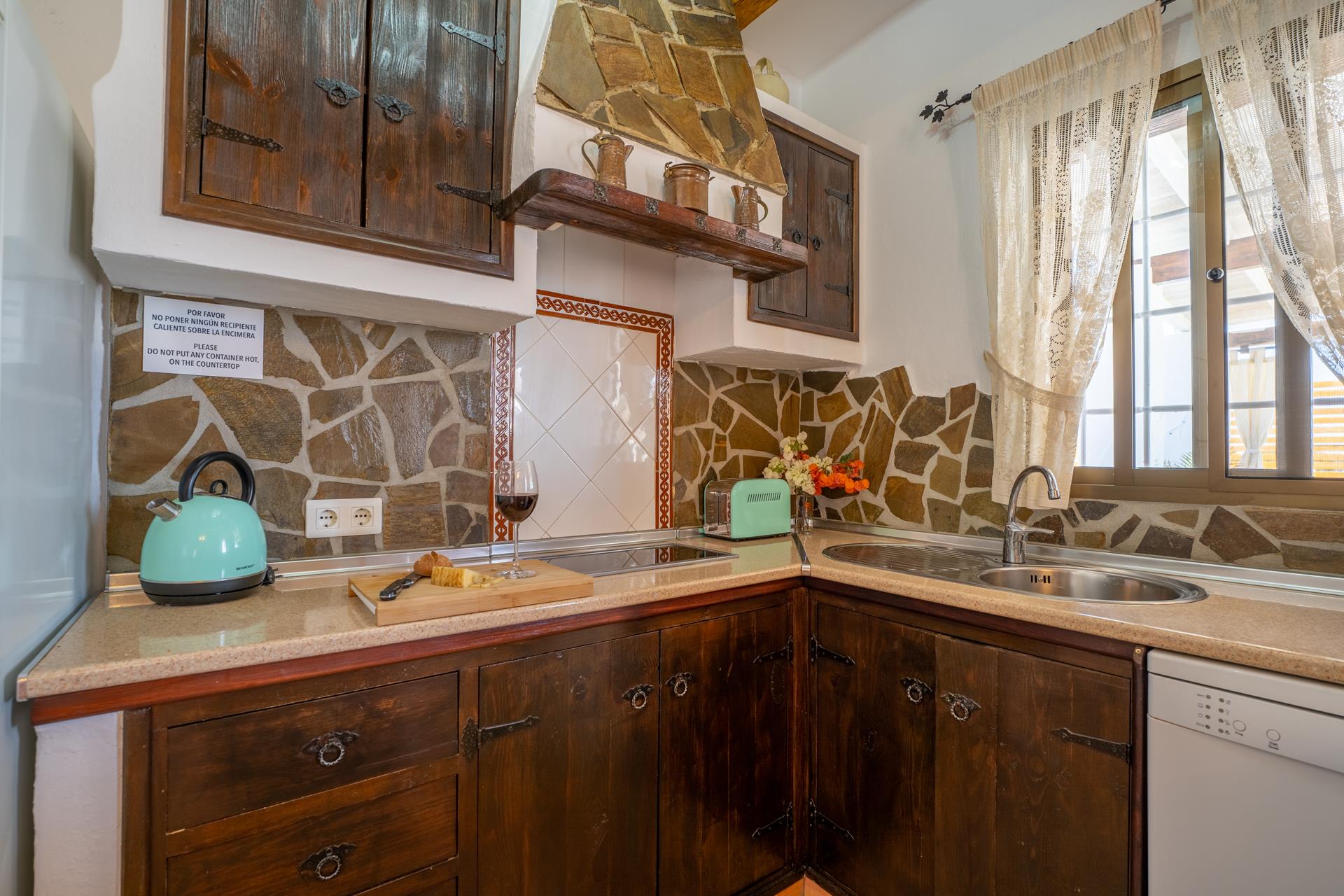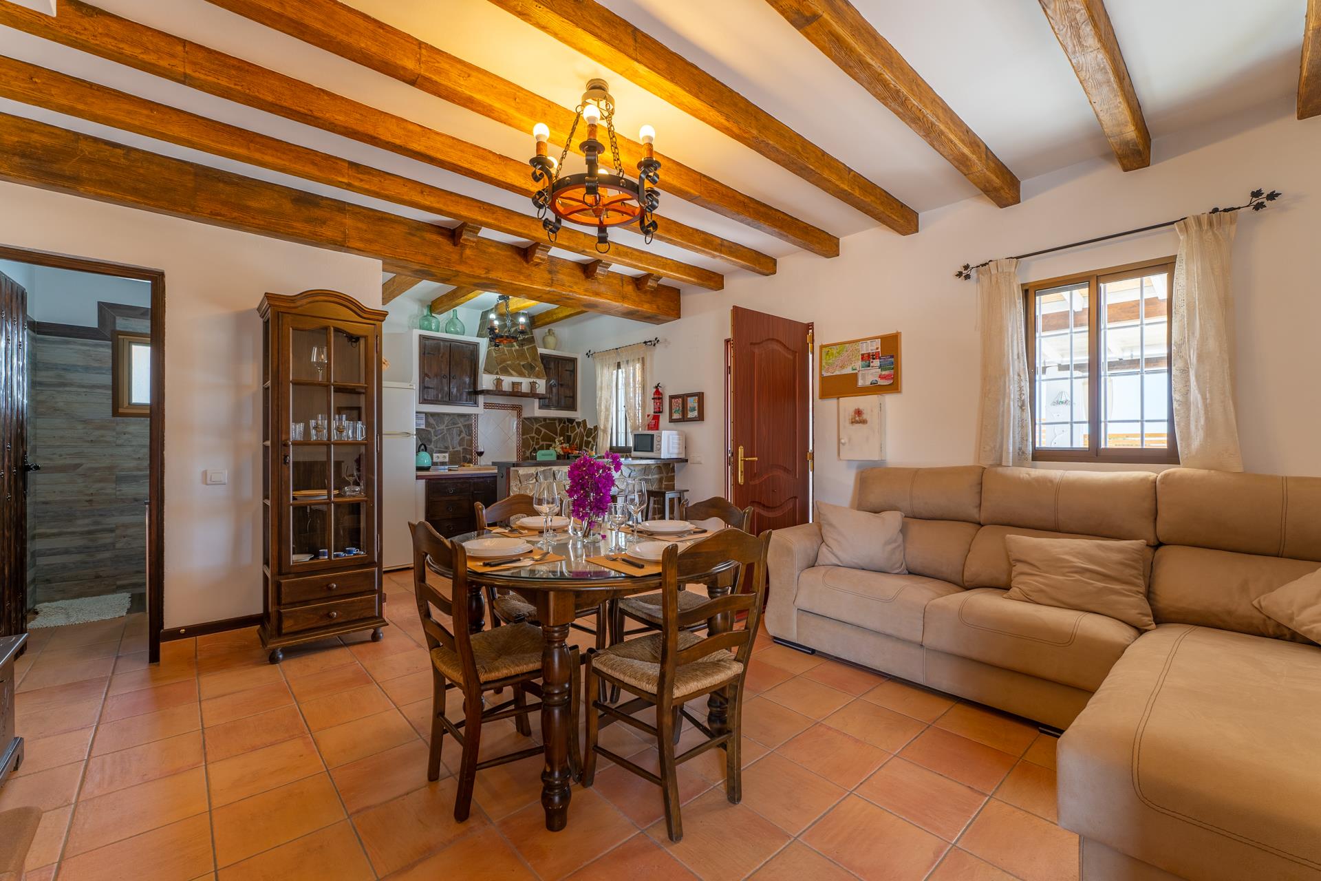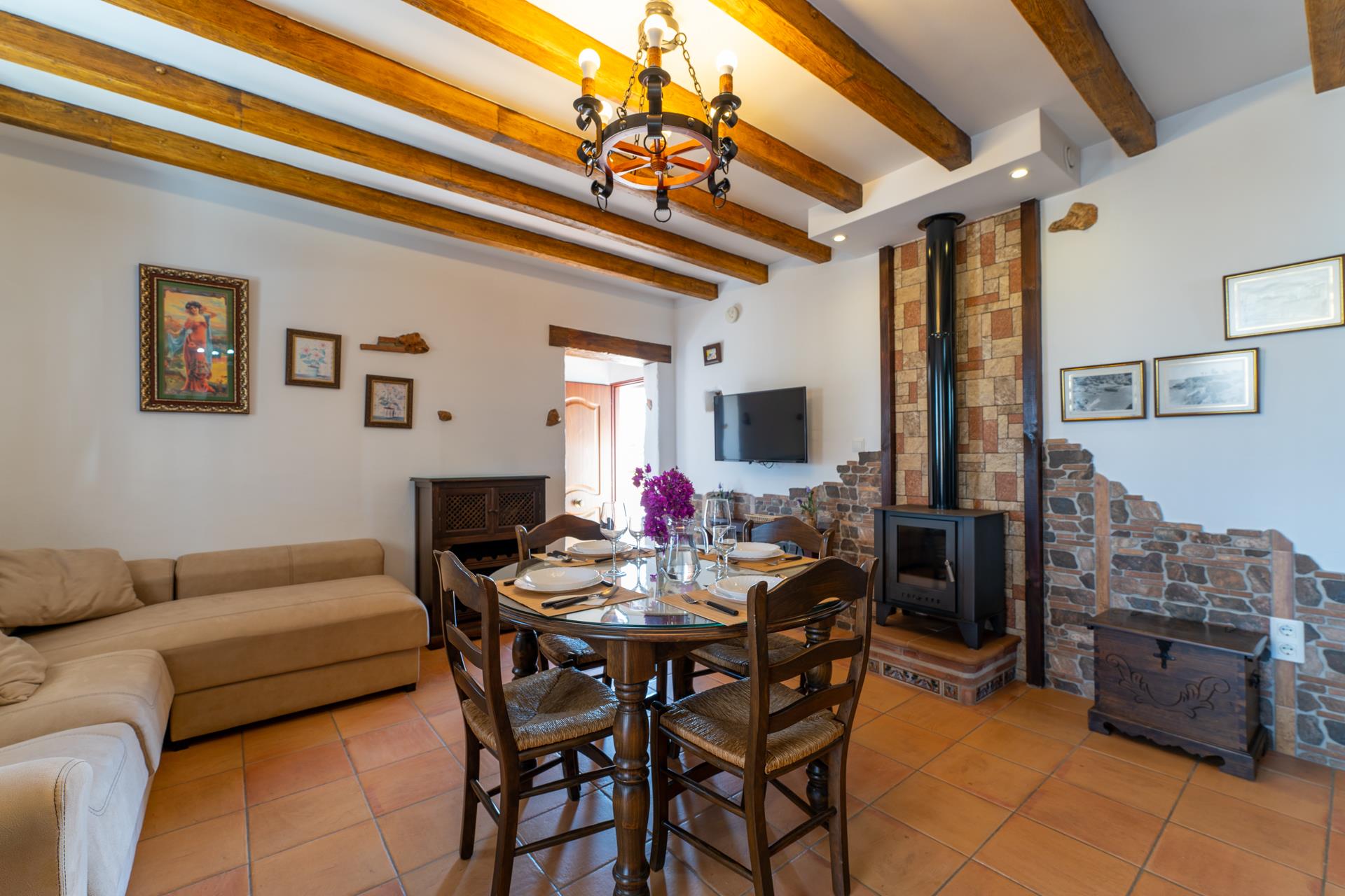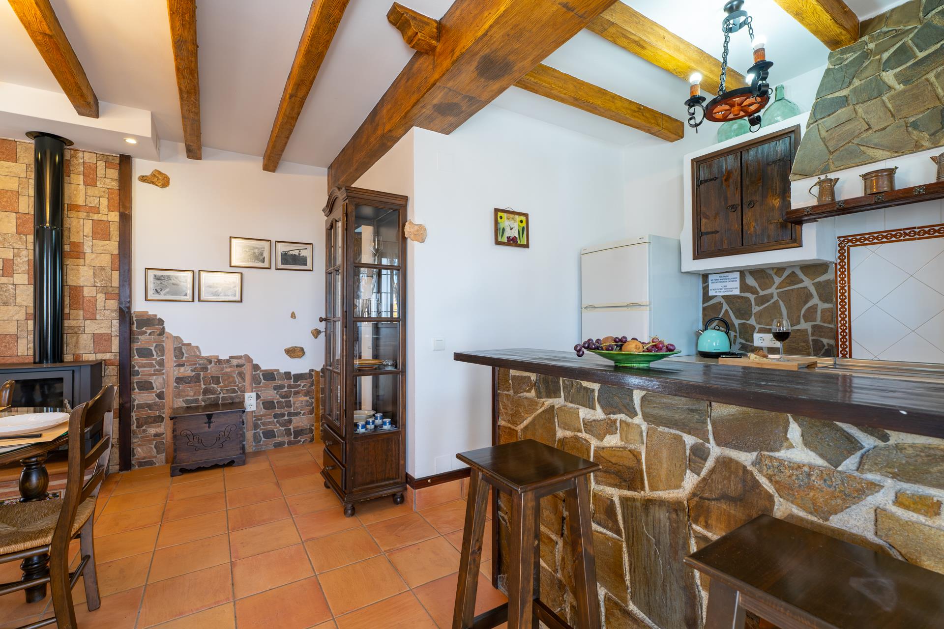 De villa is aangenaam ingericht en straalt een gezellige, rustieke sfeer uit. De zit/eetkamer is voorzien van een houtkachel, een bank, satelliet tv en een DVD speler. Een ontbijtbar scheidt de zitkamer van de keuken die is uitgerust met een 2-pits keramische kookplaat, koelkast/vriezer, vaatwasser en een magnetron. Er is een tweepersoonsslaapkamer en een compleet ingerichte badkamer in het huis en de wasmachine bevindt zich in de bijkeuken.